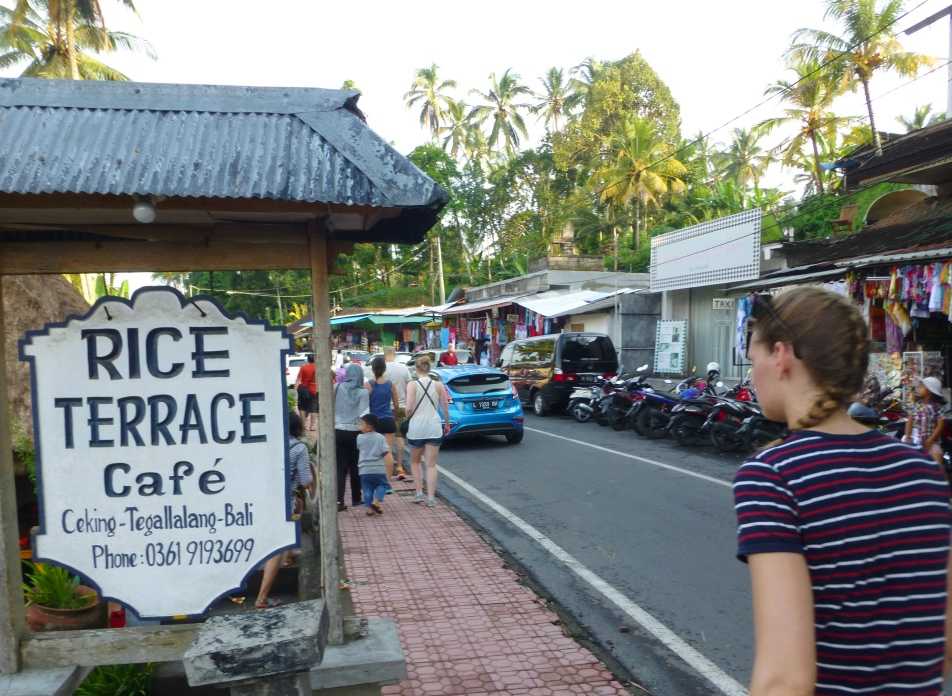 J’ai été très surpris en arrivant à Tegallalang de voir qu’il y avait deux versants à la vallée. Un versant, tel qu’on le voit sur les cartes postales, fait de terrasses étagées vert cru entre lesquelles s’écoule l’eau si précieuse. On se croirait complètement isolé en pleine nature, à des années lumières de notre monde. L’autre versant de la vallée est celui de la ville, longée par une route très fréquentée et bordée de centaines de boutiques, de restaurants et de cafés. Comme si la ville se donnait un poste d’observation pour admirer ce monde beau et magique, si irréel de l’autre rive, avant qu’il ne disparaisse. Comme un théâtre qui a son côté cour et son côté jardin. Je me suis engoncé dans le fauteuil d’un café d’une petite ruelle en escalier, côté ville, pour faire abstraction du reste et rêver en regardant ce côté campagne si apaisant.