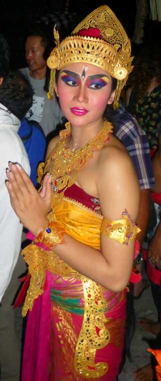 Le kecak est un spectacle traditionnel revisité par des artistes occidentaux (Walter Spies, Béjart,…). La musique est faite exclusivement de percussions vocales : plusieurs dizaines d’hommes assis en cercles concentriques et torses nus rythment, en se balançant puis en agitant les mains vers le ciel, une sorte de psalmodie claquante : "tchak a tchak a tchak a tchak" … quasiment jusqu’aux transes. Au milieu de ce cercle animé comme les vagues de la mer, entrent, bondissent et combattent des personnages costumés hauts en couleurs qui racontent des scènes tirées du Ramayana, livre sacré de l’hindouisme. Nous y reviendrons par des vidéos que j’ai rapportées.