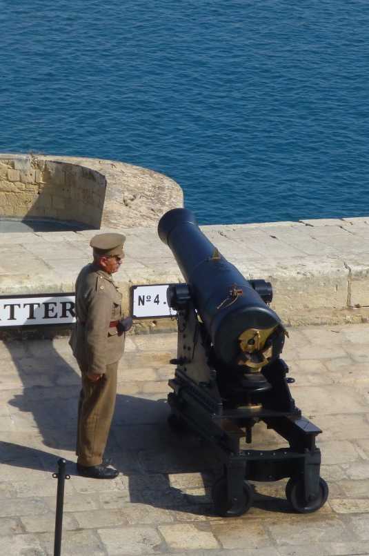 En haut du jardin Barrakka, j’ai assisté à la cérémonie, qui a lieu chaque jour à midi et à 16 heures pétantes, du tir du canon. Un militaire en grand uniforme s’avance auprès de l’un des canons de la "saluting battery". Il arme ce canon, se recule et tire un coup unique qui fait sursauter tous les touristes regroupés au-dessus. J’ai eu l’impression d’un cérémonial très british qui m’a rappelé combien cet espace convoité du port avait été l’objet de rudes batailles dans l’histoire, dont le "grand siège " mené par les ottomans en 1565.