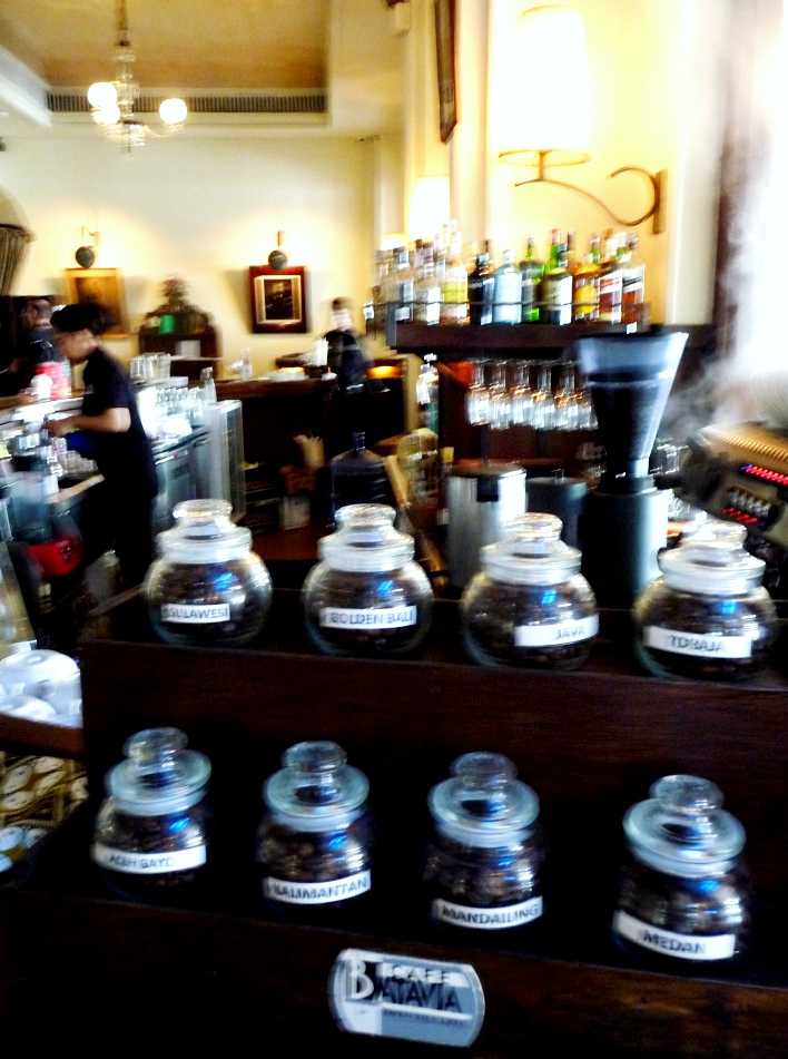 Fantômes d’explorateurs et d’artistes. Sous les pales de ses grands ventilos et derrière ses persiennes, le café Batavia de Jakarta respire la nostalgie des grands explorateurs, accros de palaces orientaux et de high tea british. En jouant avec les anachronismes et en tordant la géographie, je verrais bien dans ce lieu Agatha Christie y saluer Livingstone, Hemingway y engloutir un double whisky en compagnie de Joseph Kessel ou Patricia Highsmith interpeller J K Rowling…. En fait, aucun de ces auteurs à ma connaissance n’a mis les pieds ici, mais leur esprit flotte dans les vapeurs aromatiques de cafés de Java, Sumatra, Kalimantan, Papouasie ou Sulawesi qui s’échappent de ce lieu intemporel et universel. Seul peut-être le poète Rimbaud aurait pu chercher l’inspiration ici quand il fit une mystérieuse escapade à Java, mais à son époque ce café n’existait pas.