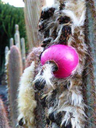Dans cette cuvette tapissée de roches boursouflées et de lapilli (fin gravillon retombé des volcans appelé ici "picon)), il a construit un labyrinthe de cactus. Plus d’une millier d’espèces venues de tous les continents, de toutes les formes, de toutes les tailles, énormes ou minuscules, poilus, ventrus, tordus, élancés, boudinés, coloriés de fleurs inattendues,… Un amphithéâtre de l’étrange et de l’extraordinaire, étagé de murets et tapissé de dallages de pierres prises sur place, rougeoyantes comme le ciel du soir de ma visite. Même la boutique de souvenirs et le bar coiffés d’une coupole rouge cochenille s’intègrent dans ce paysage flamboyant, anfractuosité infernale métamorphosée en jardin paradisiaque.