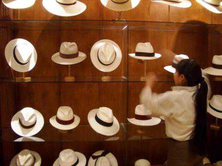 J’ai pu visiter à Cuenca une de leurs fabriques où des femmes assises les tressent à la main. Une grande partie de ces chapeaux souples - blancs ou ivoire pour la plupart - rehaussés d’un ruban noir sortent des ateliers de Cuenca. Les feuilles de palmes utilisées sont remontées de plantations de la côte puis bouillies, séchées au soleil, tressées à la main, lavées à l’eau oxygénée et moulées. Dans la pénombre de l’atelier où ils se reposent j’ai vu des entassements de milliers de ces chapeaux en train de sécher avant d’être terminés. Les plus distingués de ces chapeaux sont vendus jusqu’à plusieurs milliers de $ dans des boutiques de luxe aux dandys des grandes capitales mondiales. La boutique que j’ai visitée à Cuenca en montrait de plusieurs couleurs mais je me suis laissé séduire par un beau classico-classique que je trouve le plus chouette.