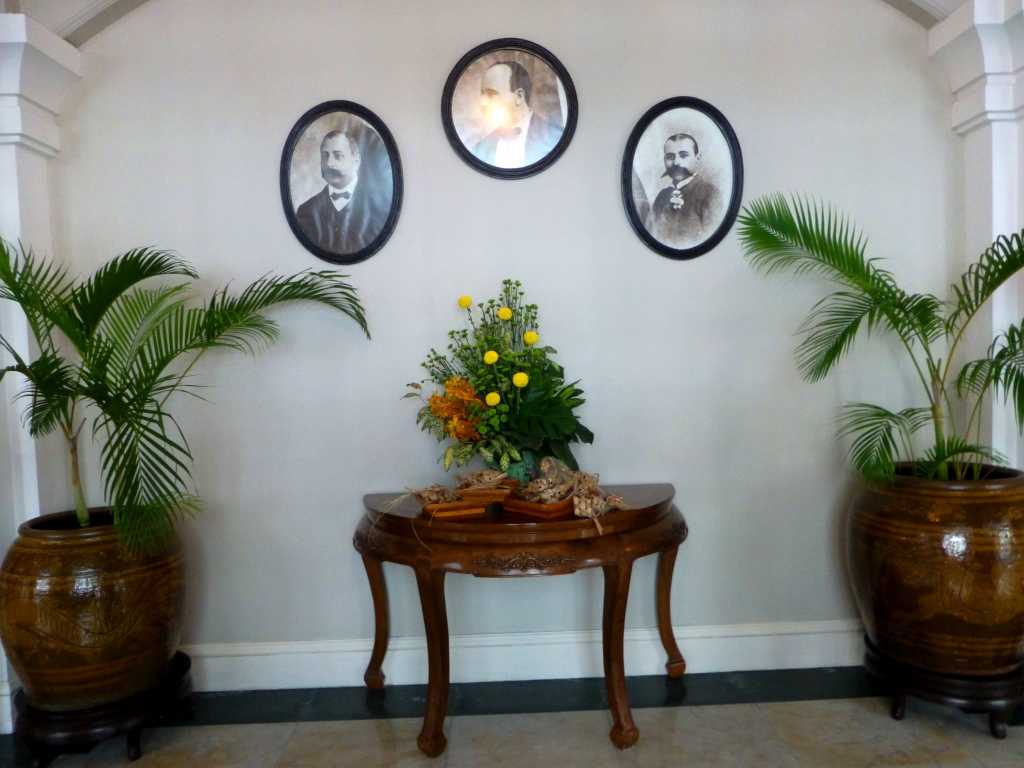 Car avant d’être embarqué dans ce profond sommeil onirique, j’avais exploré les couloirs de cet immense vaisseau fantôme, marqué dans tous ses recoins du logo très exclusif "E&O". Des employés en costume noir et nœud papillon, au sourire obséquieux, vont, viennent et virevoltent en glissant sur des carrelages aux immenses damiers noir et blanc. Dans un recoin de ce jeu de go géant, je tombe sur les portraits inattendus de trois imposantes moustaches en guidon de vélo très XIXème, pas du tout aux yeux bridés. Renseignement pris, il s’agit des trois frères arméniens, les Sarkies (Arshak, Tigran et Martin) réfugiés dans cette commissure du monde et qui ont fondé ce palace fabuleux du temps de la reine Victoria, après l'ouverture du canal de Suez . Un coup d’essai puisqu’ils ont ont ensuite créé dans la région des hôtels encore plus mythiques, le Raffles à Singapour, puis le Strand à Rangoon.