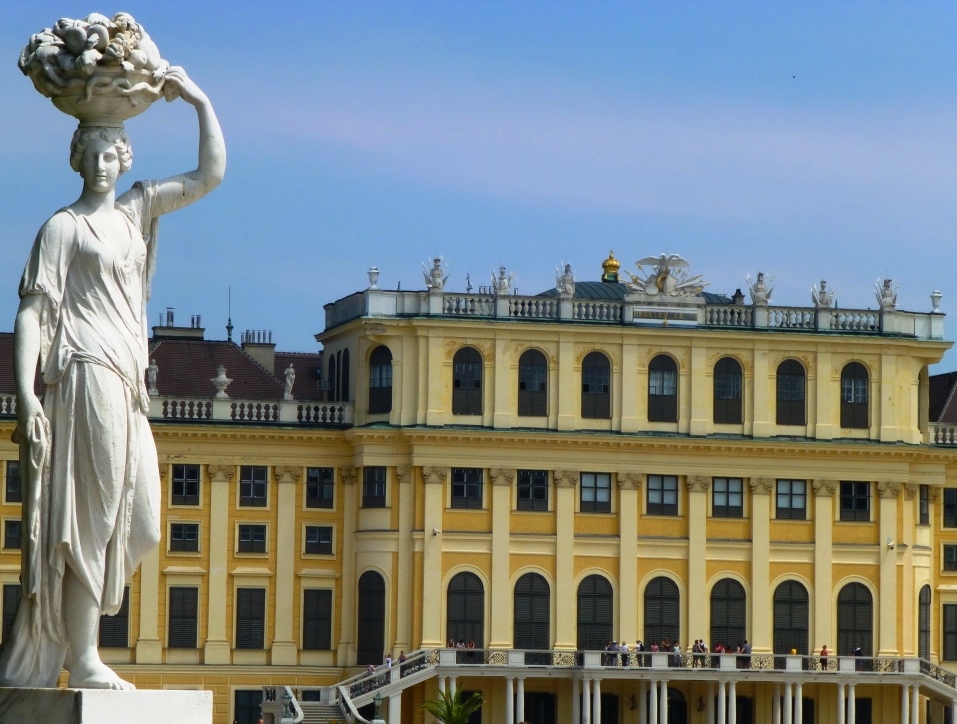 Mais qui a construit un tel palais et pourquoi ? Pour comprendre, j'ai ressorti les livres d’histoire : la construction de Schönbrunn, fut lancée en 1683. L’armée autrichienne venait juste de défaire les turcs menés par le grand vizir Kara Mustapha aux portes de Vienne. En construisant ce château, l’empereur de l’époque, Léopold 1er de Habsbourg, voulait rivaliser avec le château, bâti quelques années plus tôt, par Louis XIV à Versailles. 50 ans plus tard, l’impératrice "Marie-Thérèse la Grande", dont les statues trônent encore partout à Vienne et qui passait tous ses étés à Schönbrunn, donna à cet édifice aux façades d’un jaune ocre un peu ambré son style rococo. Ce n’est que son arrière-petit-fils, qui s’appelait l’empereur François-Joseph (né et mort au XIXème siècle à Schönbrunn) qui épousa la belle et fascinante Sissi.