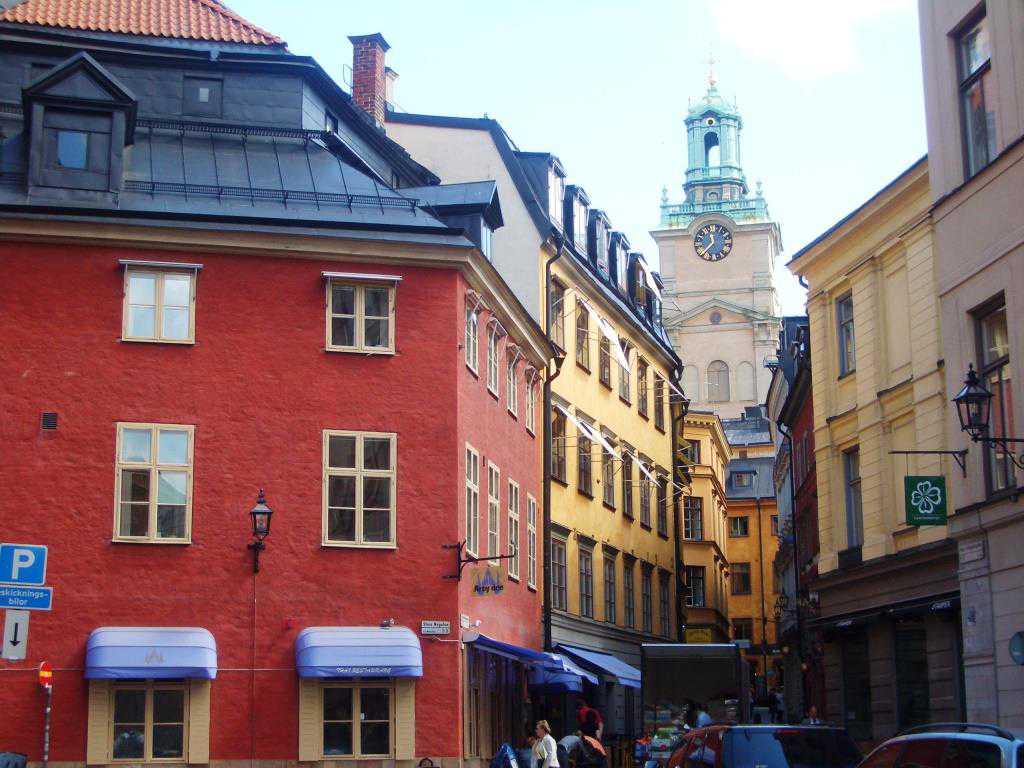 Au fond de ruelles silencieuses et de la place centrale de Stortorget dans l’île historique de Gamla Stan, j’avais l’impression d’être dans un paisible gros bourg de province aux toits vert de gris, et aux murs exhibant toute la palette des teintes de l’ocre. Sur les pavés gris, autour de la fontaine décorée de pots de pensées mauves, les bancs et terrasses de cafés ne sont troublés qu’au passage de groupes de touristes mitraillant ses façades orangées, jaunâtres, ambrées. J’y suis repassé un peu plus tard et un orchestre militaire y avait mis une ambiance détonante.